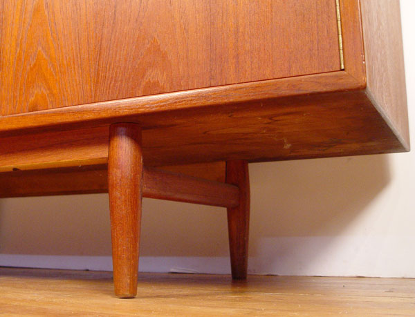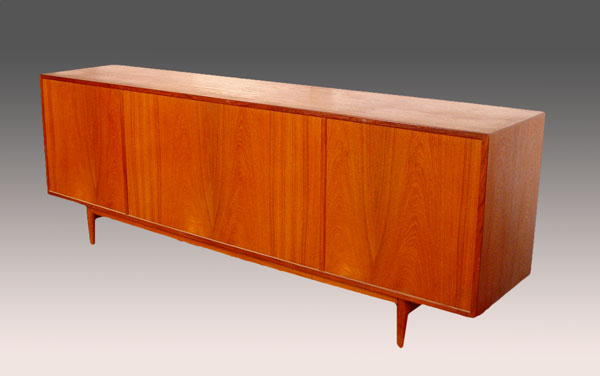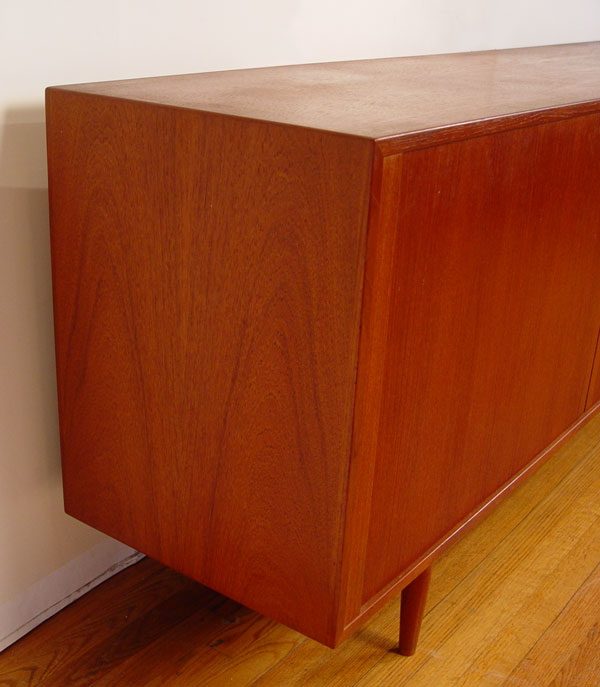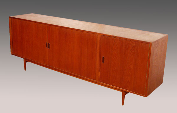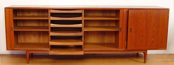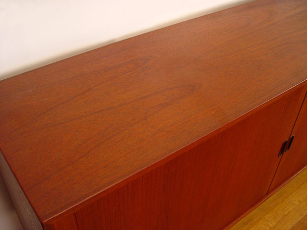 ARNE VODDER DANISH MODERN SIDEBOARD WITH TAMBOUR DOORS: Teak sideboard featuring tambour sliding doors. Four compartment interior with one having slide out trays. 89'' long x 18 1/2'' deep x 31'' tall.