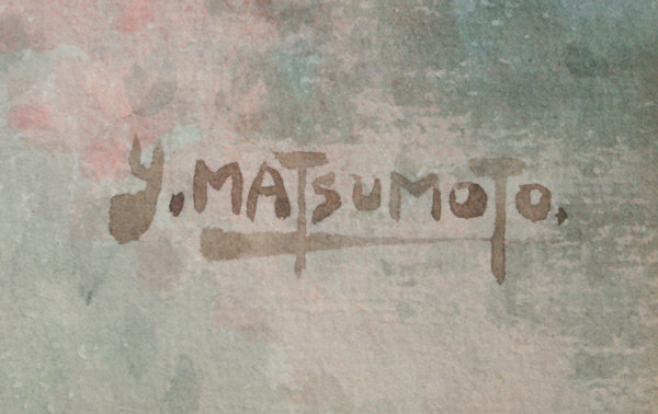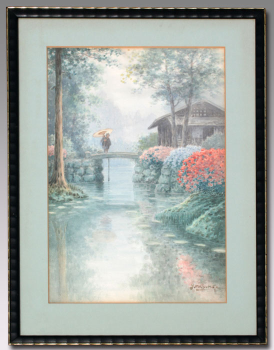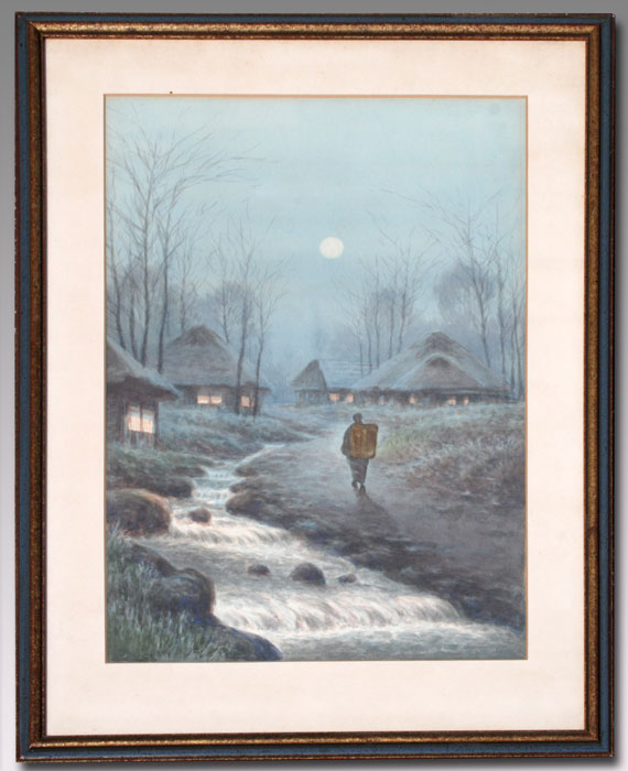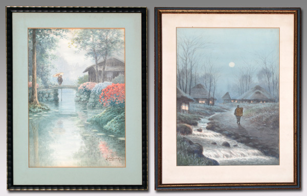 MATSUMOTO, Y. ,(Japanese, 20th C.): 2 W/C's; Figure in a Japanese Landscape, Looking into a Stream, sight size 19 1/2'' x 25 1/2'', signed, framed, 23'' x 30''; Nocturnal Scene with Figure Approaching a Village, 19 1/2'' x 25 1/2'', unsigned, framed, 23'' x 30''.