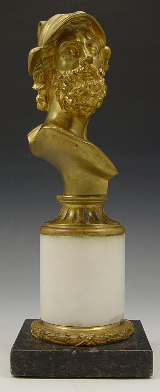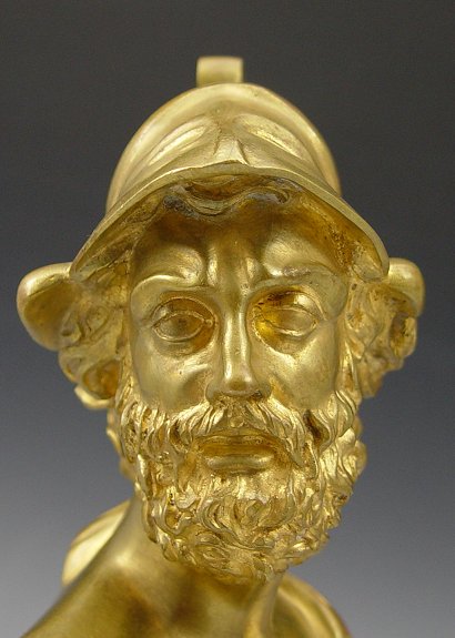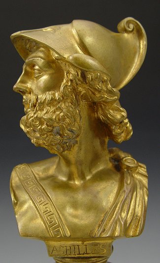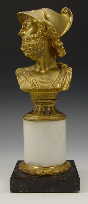 ACHILLES BRONZE BUST: Circa 1900, 11 5/8'' h., incised title, affixed to quartz and marble pedestal with some chips.