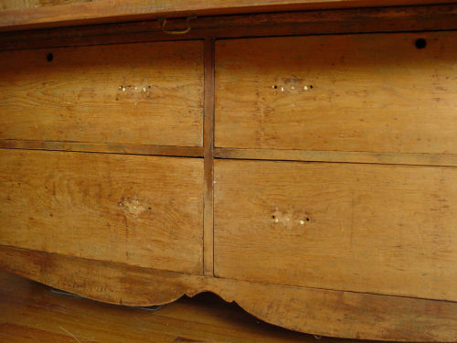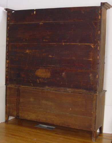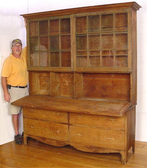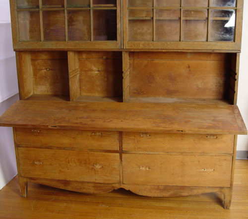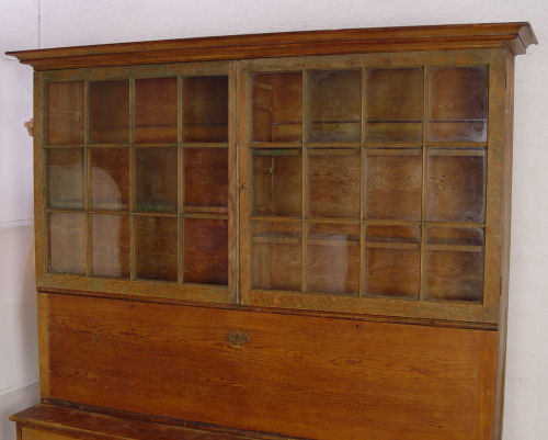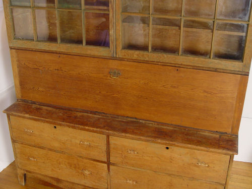 EARLY 19TH C MASTER COUNTRY STORE MERCANTILE CABINET: 2 part pine cabinet with upper section having 24 lights in the glass front doors, interior with adjustable shelves, over full length drop front with open storage, though the sides are grooved for shelving. Base has 2 over 2 deep drawers, beautiful cut apron. The pulls are missing from the drawers. 88'' high x 79'' x 20''