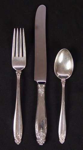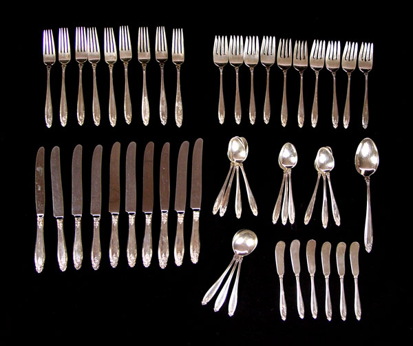 INTERNATIONAL PRELUDE STERLING FLATWARE SET: Approx. 49 pieces in the Prelude pattern from International Silver to include 9 dinner forks (7 1/4''), 10 salad forks (6 1/2''), 10 teaspoons (6''), 3 soup spoons (6 1/2''), table spoon (8 1/2''), 10 hollow knives (9 1/8''), 6 solid butter (5 3/4''). No monograms. Approx 52 troy oz.