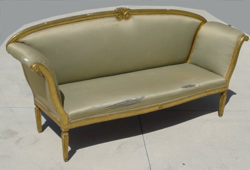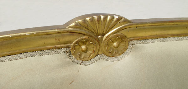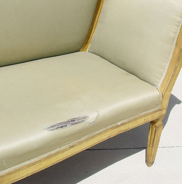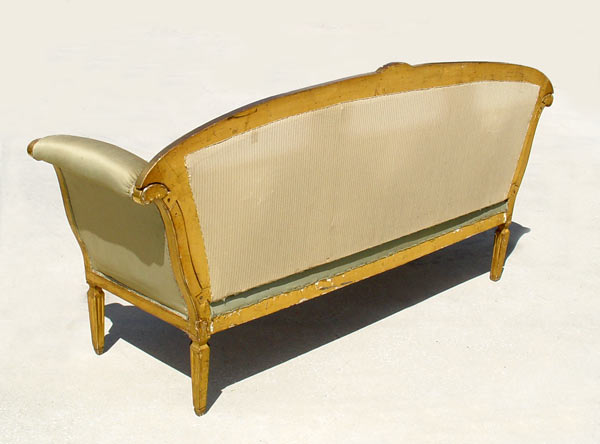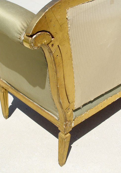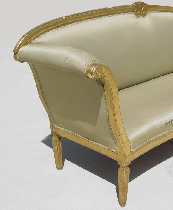 18TH C ITALIAN GILT WOOD SOFA: Regency style frame with brushed silk upholstery. Reeded legs. Please note there are stains and split in the fabric and old worm holes in frame. 41'' tall x 84'' wide x 23 1/2'' deep.