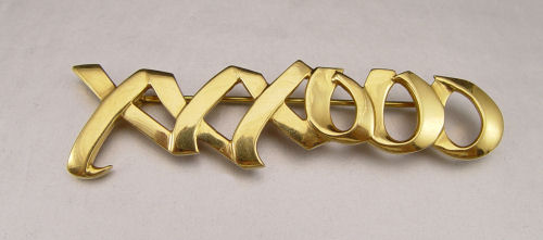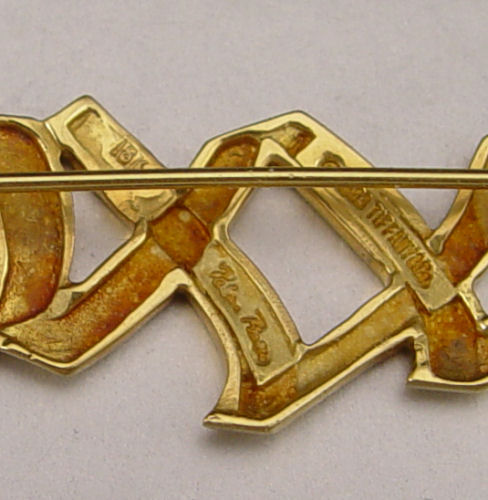 PALOMA PICASSO TIFFANY & CO LOVE & KISSES GOLD BROOCH: 18K yellow gold bar pin. Signed Paloma Picasso and Tiffany & Co 1983, also stamped 18K. 2 3/4'' length. Weight approx. 13.6 grams.