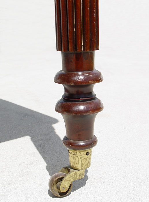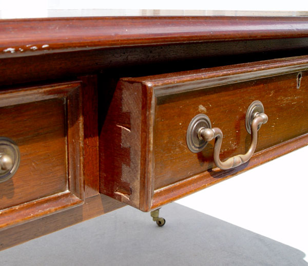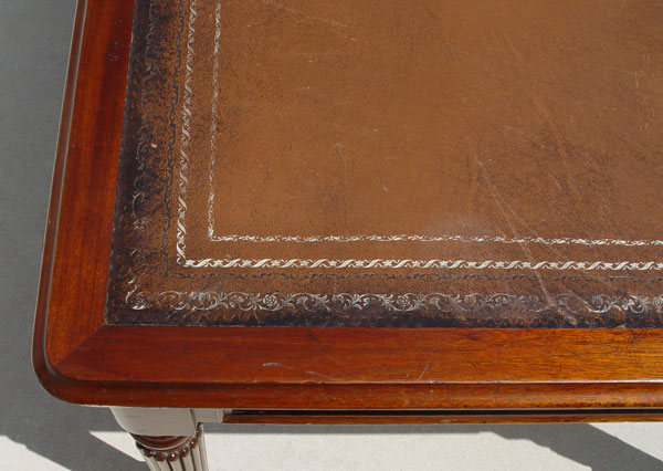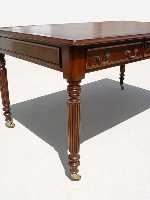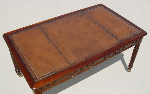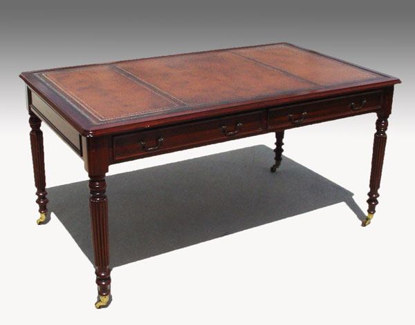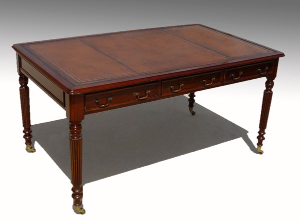 TURRETGATE FINE REPRODUCTION FURNITURE LIBRARY DESK: Made in England. 3 drawers, one with the makers label. Faux drawers on the other side. Embossed leather top. Brass castors. Approx. 30 1/2'' h. x 60 1/2'' x 36''