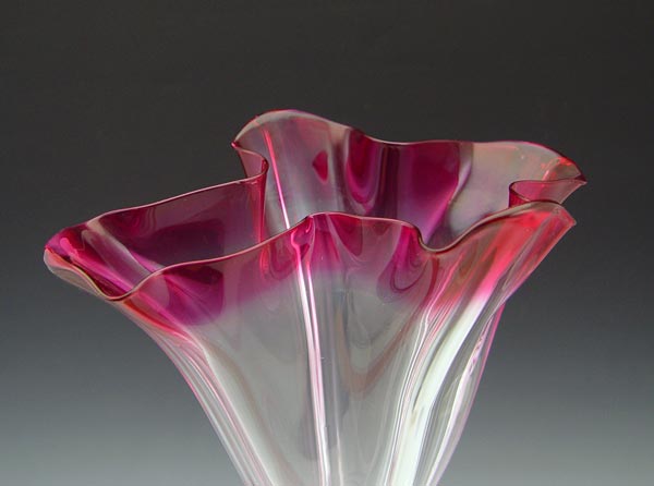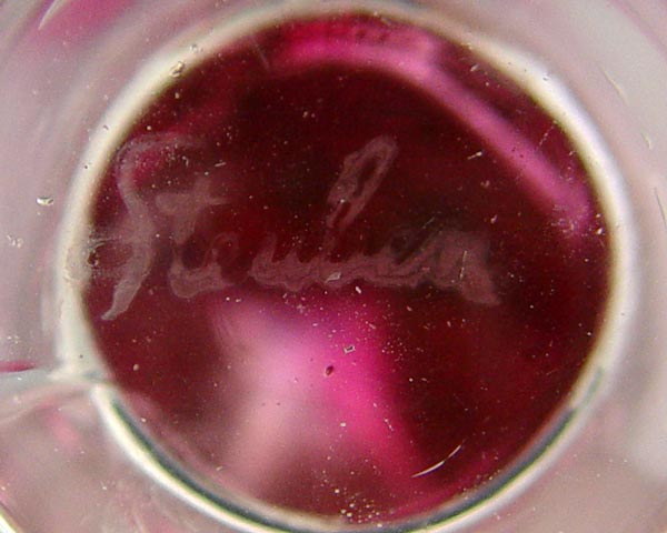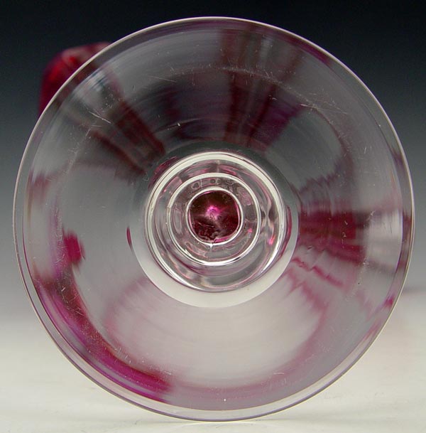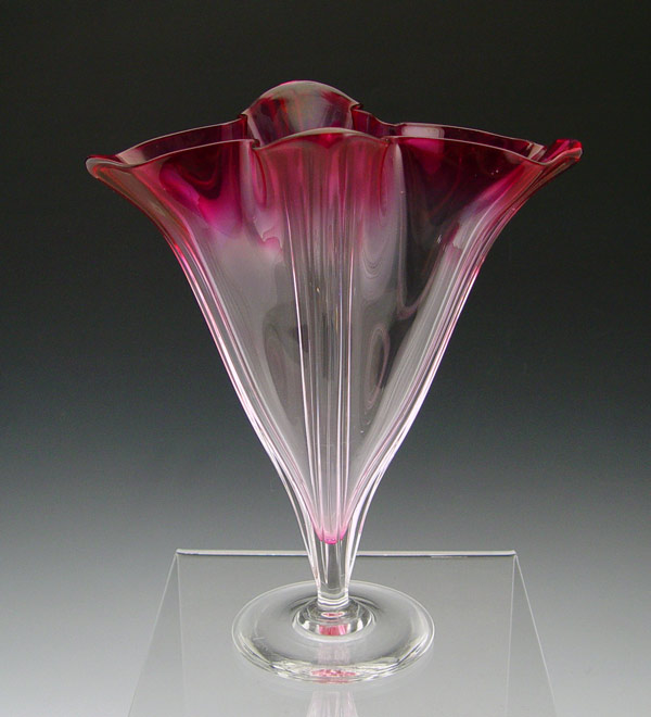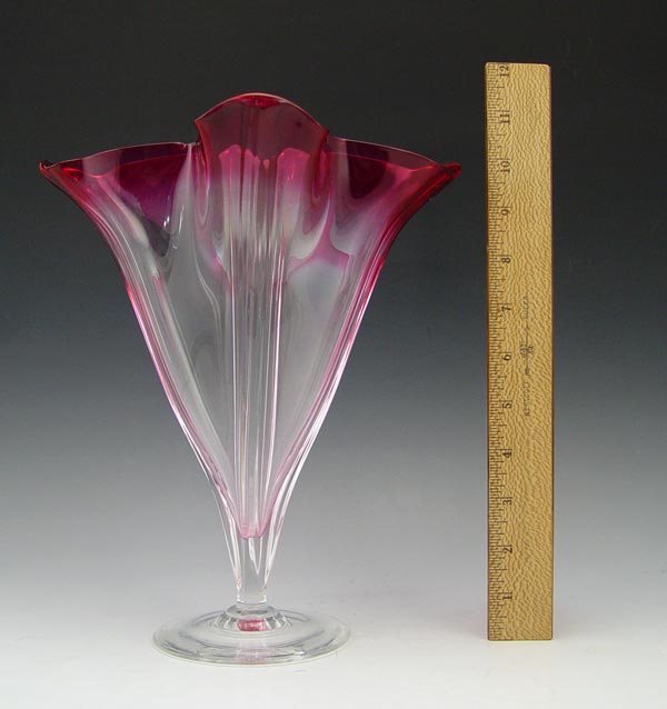 COLORLESS AND GOLD RUBY STEUBEN GROTESQUE ART GLASS VASE: Ca. 1932. Acid etched script signature to bottom. 11'' tall.