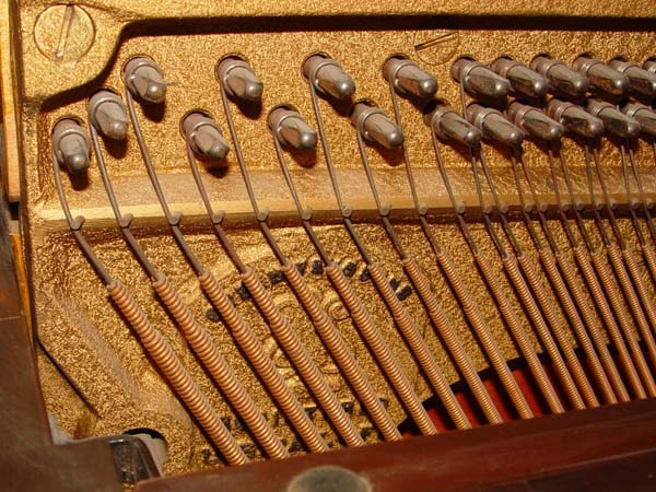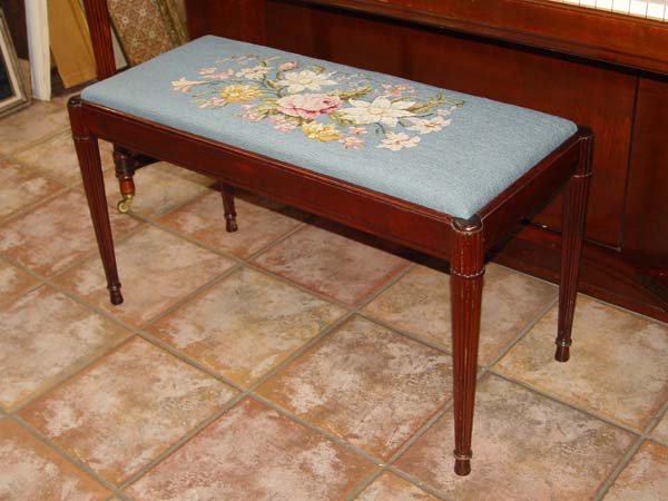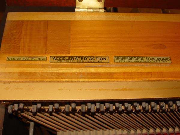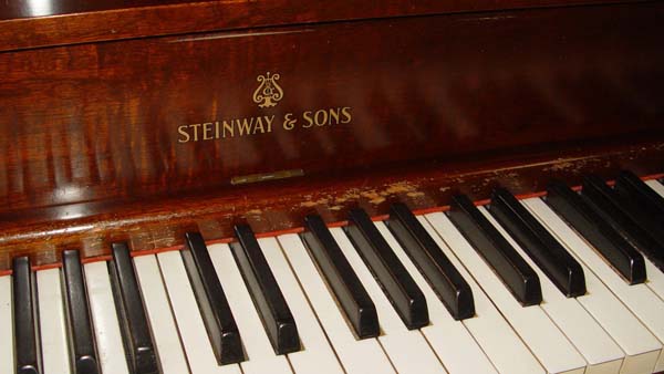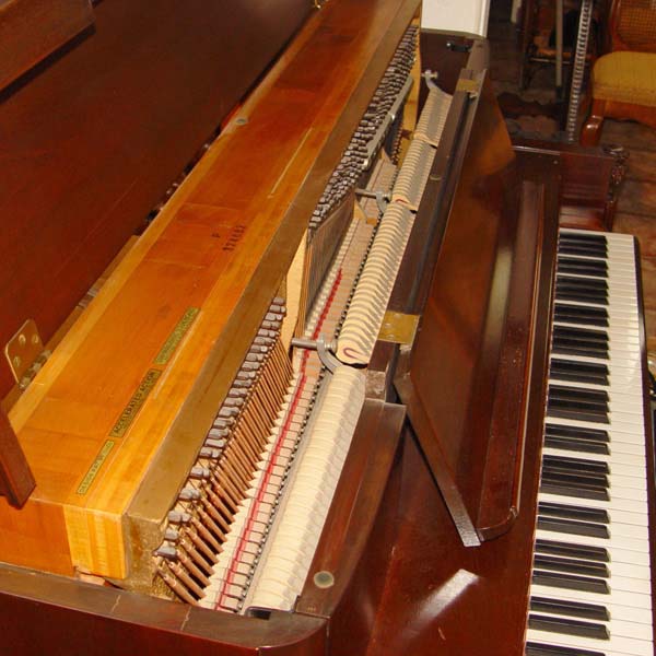 STEINWAY & SONS MAHOGANY CASE REGENCY UPRIGHT PIANO: Upright or vertical piano, studio size. ''Accelerated Action'' and ''Diaphragmatic Soundboard''. Stamped 324682, dates 1945-1950. 45 1/2'' tall x 57 1/2' x 25''. With matching bench.