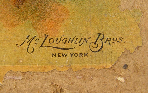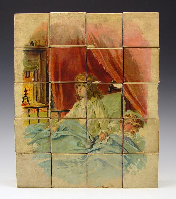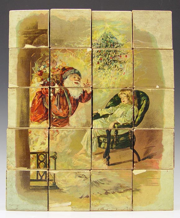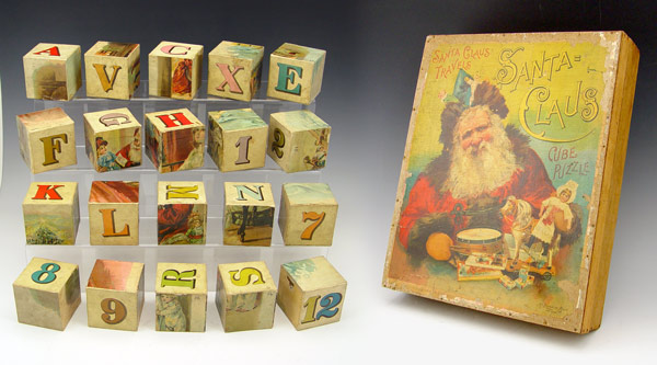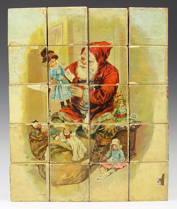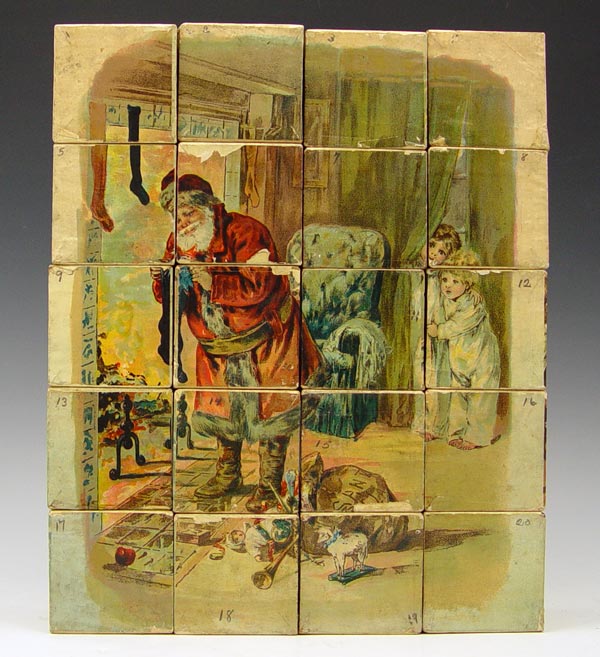 1897 MCLOUGHLIN BROTHERS SANTA CLAUS CUBE PUZZLE: Titled ''Santa Claus Travels, Santa = Claus'' With original box. All pieces present. 3'' x 13 1/2'' x 10 3/4''.