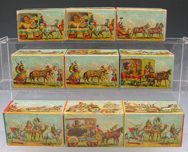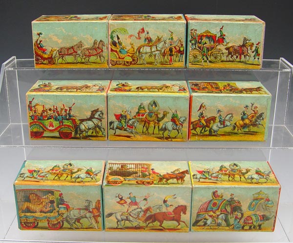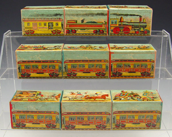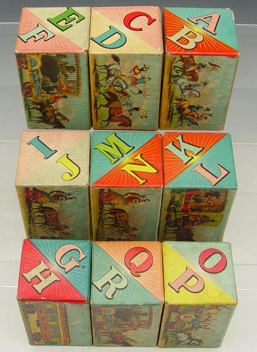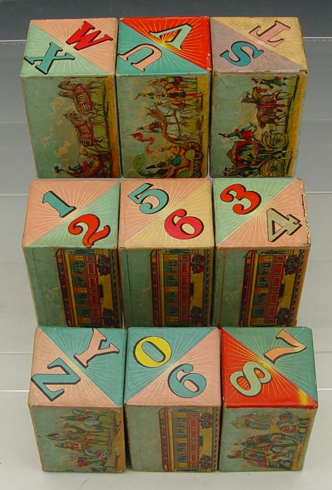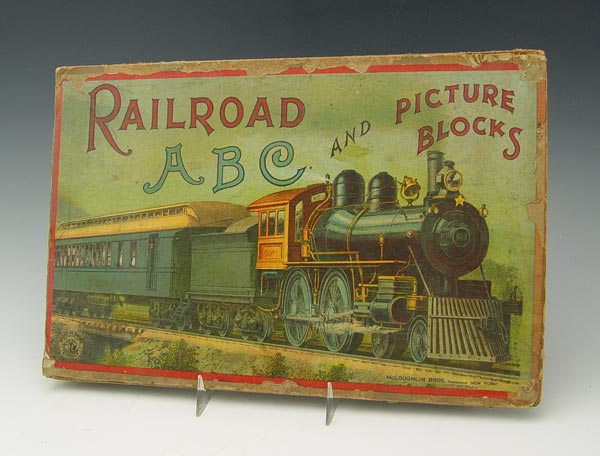 MCLOUGHLIN BROTHERS RAILROAD ABC & PICTURE BLOCKS: All blocks present, with original box. 2 3/4'' x 12 3/4'' x 8 1/2''