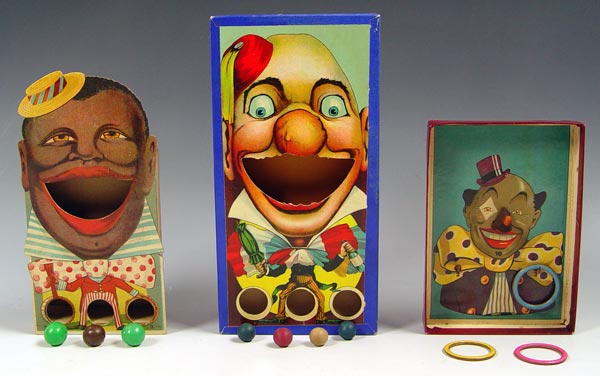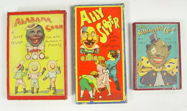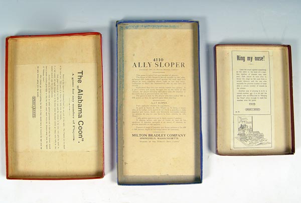 3 GAMES ALABAMA COON, THE WHITEEYED COON & ALLY SLOPER: To include 1) ''Alabama Coon'' A Jolly Game by Spears Games. Comes with 3 celluloid balls, note 2 are cracked. Original box, note condition. 1 3/4'' x 11 1/2'' x 7 3/4''. 2) ''The Whiteeyed Coon'' by Spears Games. Comes with 3 rings. Original box, note condition of corners. 1 1/4'' x 8 7/8'' x 6 1/4''. 3) ''Ally Sloper'' by Milton Bradley. 1907, comes with 4 wooden balls. Original box, note condition. 1 3/4'' x 13'' x 6 3/4''.