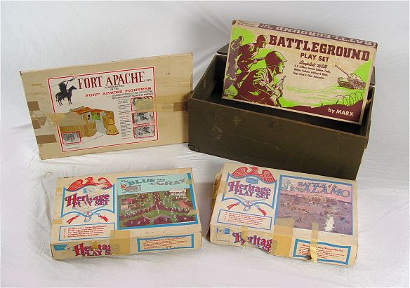 TRUNK WITH VINTAGE ACTION PLAY SETS: Includes Marx Battleground, Mark Fort Apache, Heritage ''The Blue & Grey'', Heritage ''Battle of the Alamo''. Trunk measures 13'' x 32'' x 16'' Please note wear & use.