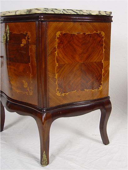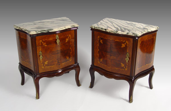 PAIR MARBLE TOP FRENCH STYLE NIGHTSTANDS: One with small drawer over single door and one with door only, serpentine front, inlay design, 26''h x 23''w. x 13 1/2''d.