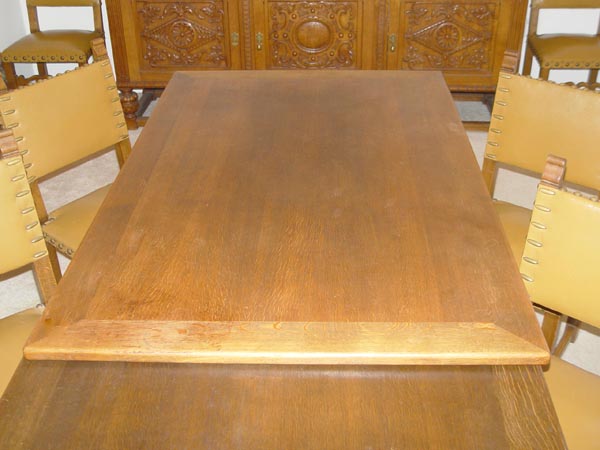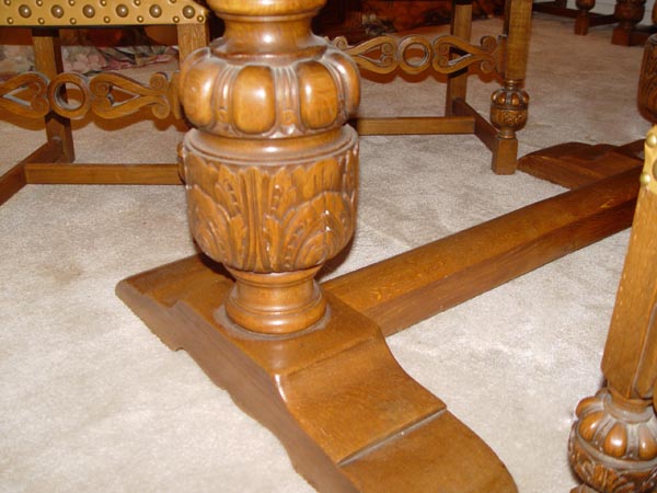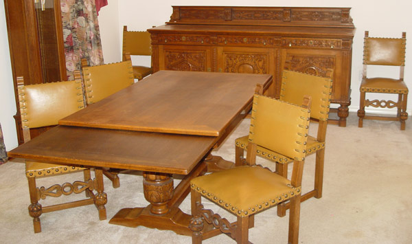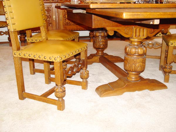 GRAND VICTORIAN OAK DINING TABLE WITH 6 CHAIRS: Draw leaf table on carved trestle base, 62.3/4'' plus two 24'' leaves, 38''h. Six side chairs with leather upholstery and large tack trim, carved section on front legs match base of table, 19''h. seats, 37 1/2''h.
