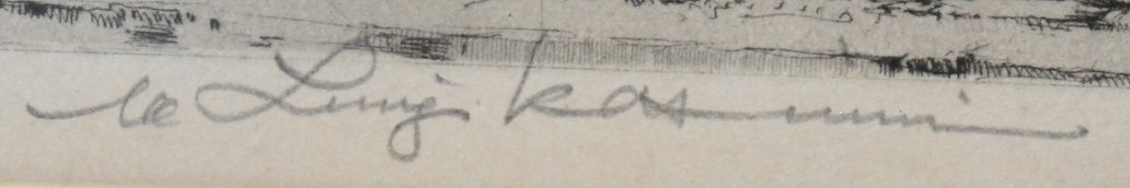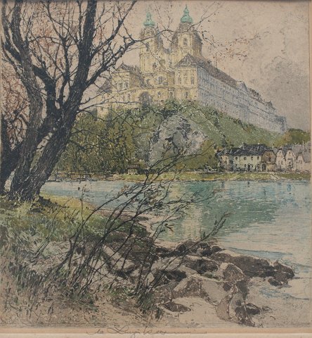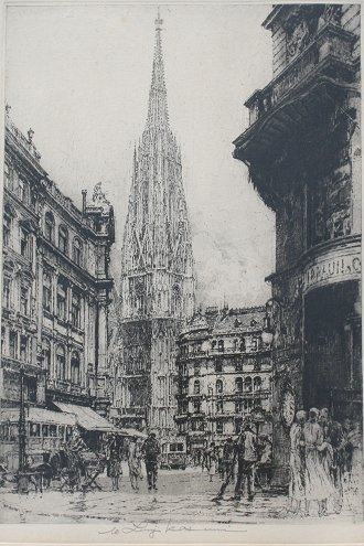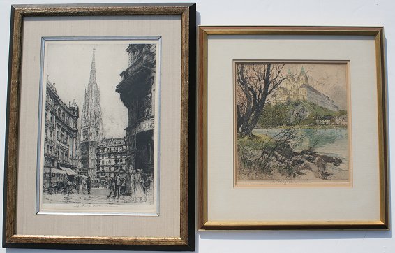 KASIMIR, Luigi, (Austrian, 1881-1962): 2 Etchings, estate signed, ''Melk on the Danube'', sight size 9 3/4'' x 9'', 16 1/2'' x 15 1/2'' with frame; Austria, Vienna, St. Stephen's Graben, 14' x 9 1/2'' sight size, framed, 20'' x 16''.