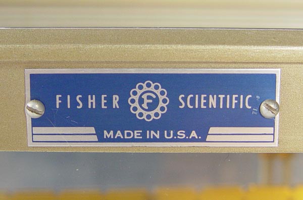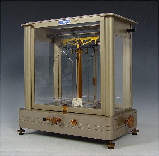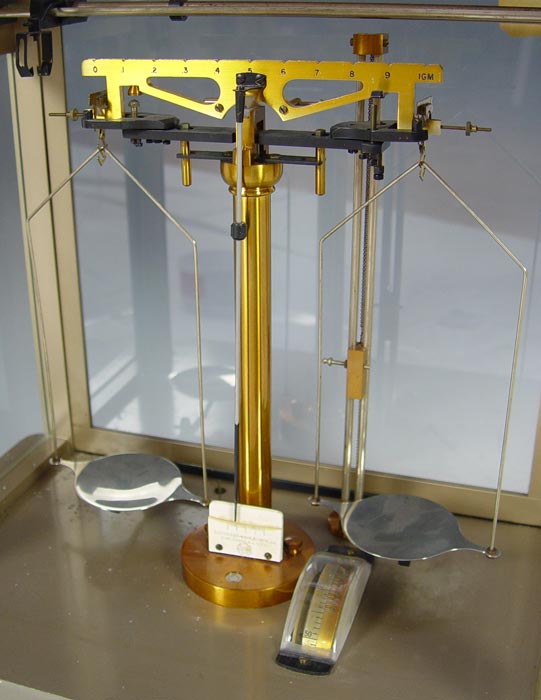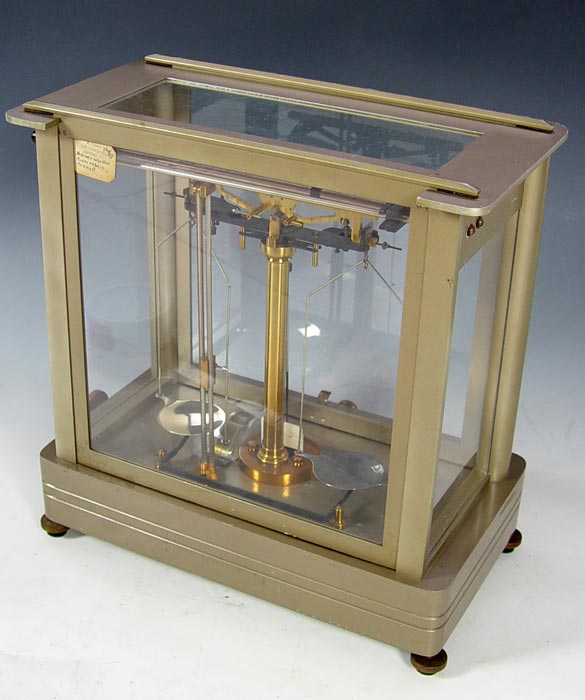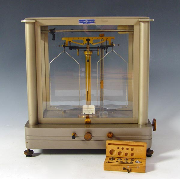 FISHER SCIENTIFIC SCALE IN GLASS CASE: Beam scale, sold with weights. Note finish. 17 1/2'' x 16 1/2'' x 10 3/4''.