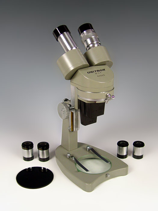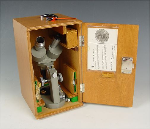 UNITRON MSF MICROSCOPE IN OAK CASE: 2X & 4X magnification. Comes in oak case with 2 keys. Case measures 14 1/2'' h. x 7 1/2'' x 8 1/2''.