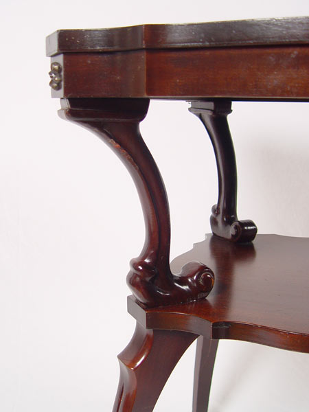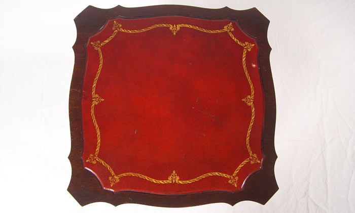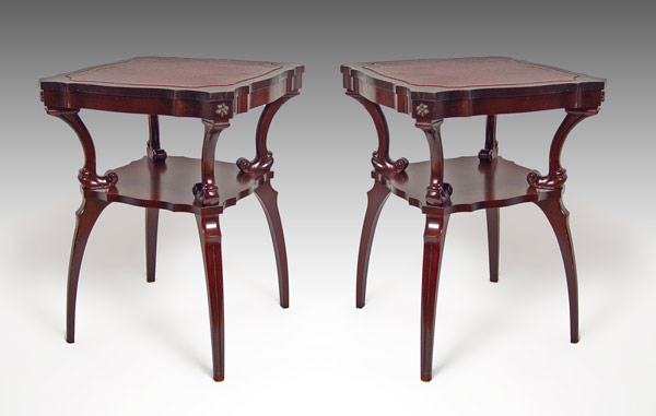 PAIR 1940'S MAHOGANY RED LEATHER TOP SIDE TABLES: Two tier, 29 1/4'' h. x 21 3/4'' square