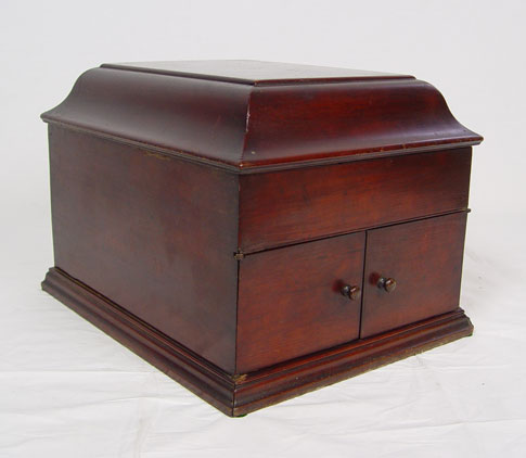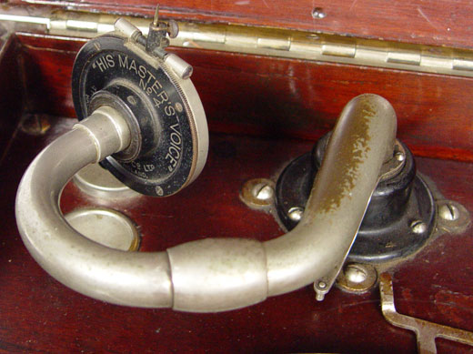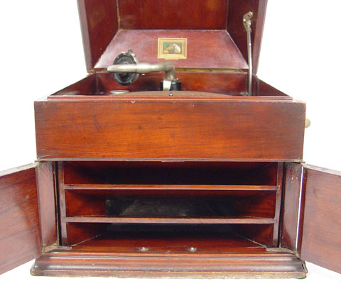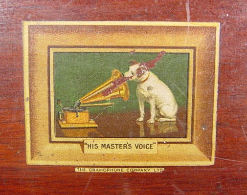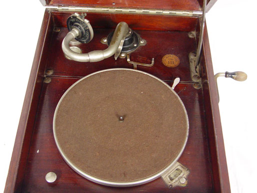 MAHOGANY GRAMOPHONE MODEL 111 WITH RECORDS: Mahogany case. Cranks and spins, needs adjustment. Comes with spare needles, other spare parts. Comes with 9 records, include a Marilyn Monroe record.