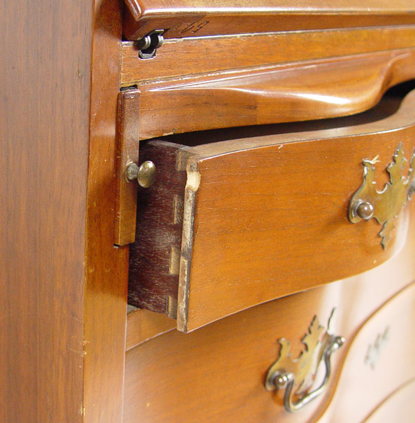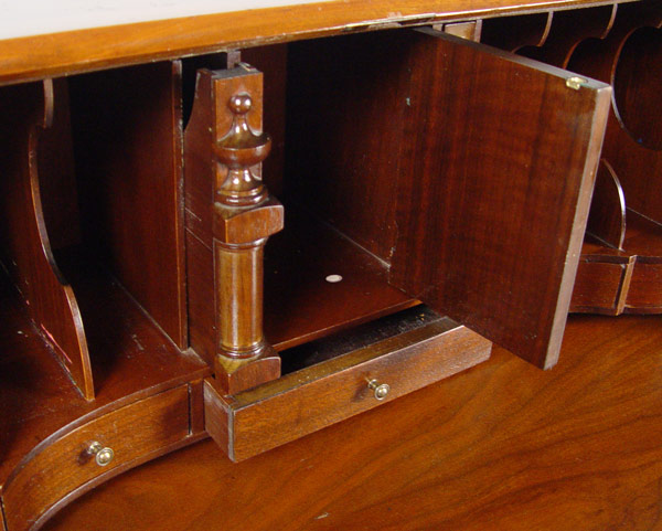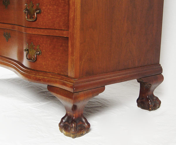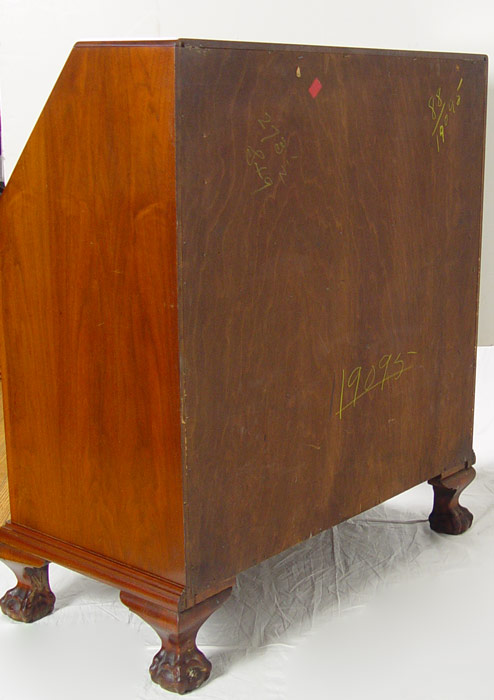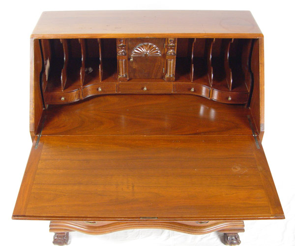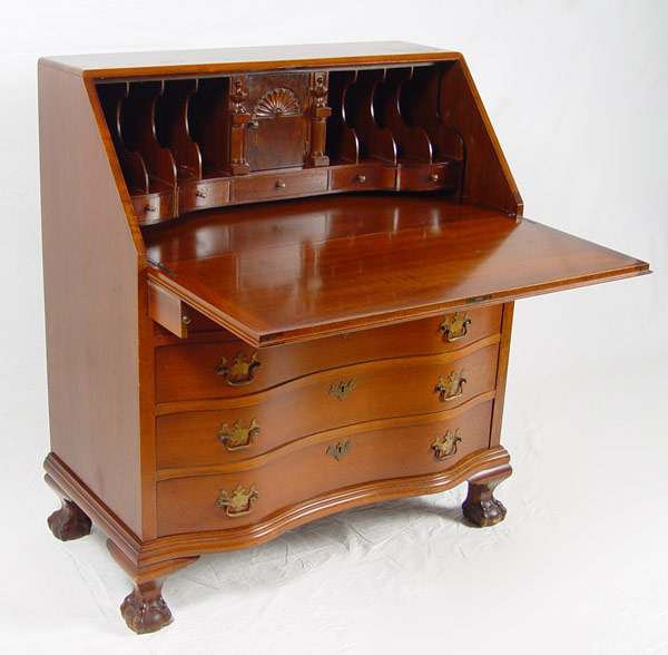 CLASSIC GOVERNOR WINTHROP STYLE DROP FRONT DESK: Scandia Furniture, Rockford IL. Serpentine front of four drawers, ball and claw feet. Fitted interior. 41 1/2''h. x 36'' wide x 37'' deep.