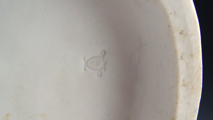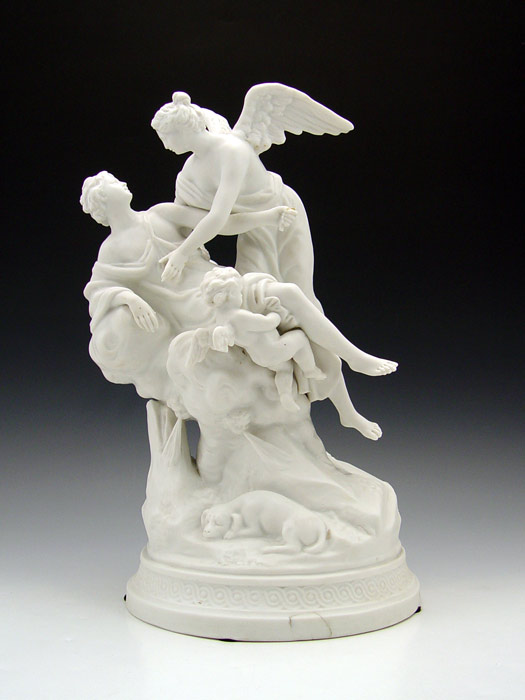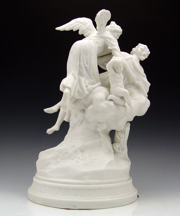 PARIAN WARE FIGURAL GROUP: Angel, cupids, and putti surround a woman with a dog at her feet. Marble like parian bisque, impressed Sevres type cartouche mark. On a stepped round base. 13 1/2'' tall. 7 3/4'' dia. base.