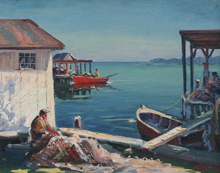 STARK, Melville, (American, 1903-1987): Cortez Docks, OIL/Board, 15'' x 20'', signed, signed and titled verso, framed, 20 1/2'' x 25''.