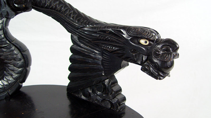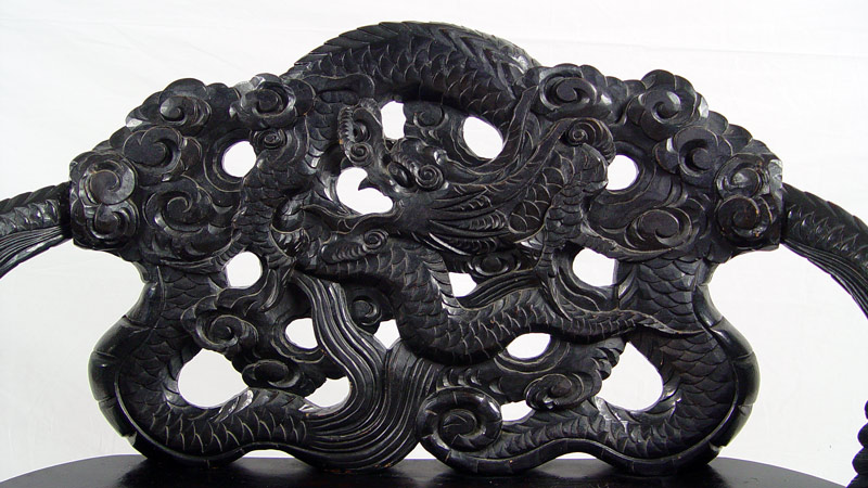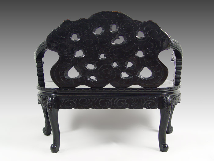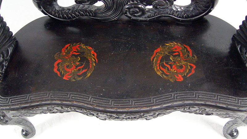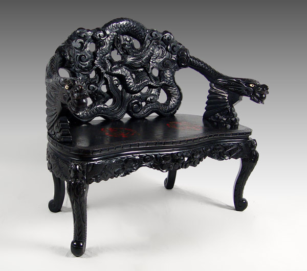 CHINESE CARVED AND LACQUERED SETTEE: Heavily carved depicting flying dragon with the arms ending in dragon heads. Bone eyes. Double dragon painted medallion on seat. 34 1/2'' tall x 19'' deep.