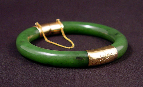 JADE & 14K GOLD HINGED BANGLE: Hinged bangle of 14k yellow gold and deep green jade, pressure clasp, marked 14k, with safety chain. Interior opening approx. 2 1/4'', overall approx. 3'' diameter.
