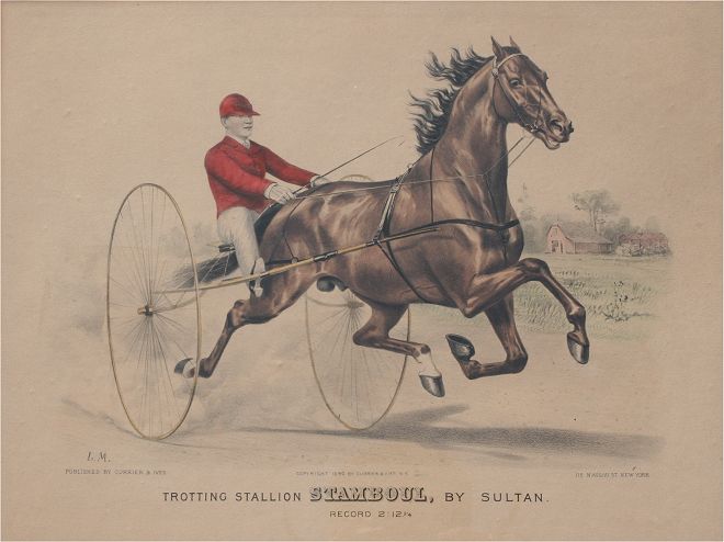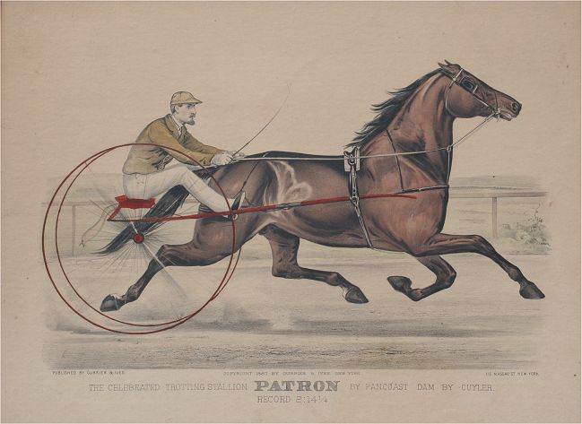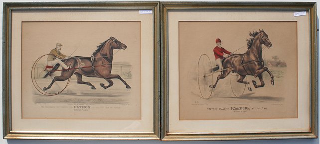 2 CURRIER AND IVES EQUESTRIAN LITHOGRAPHS: ''Trotting Stallion Stanbul'', copyright 1890; ''The Celebrated Trotting Stallion Patron'', COPYRIGHT 1887, 12 1/2'' x 16 1/4'' sight size, worn silvered matching frames, 17 1/2'' x 21 1/2''.