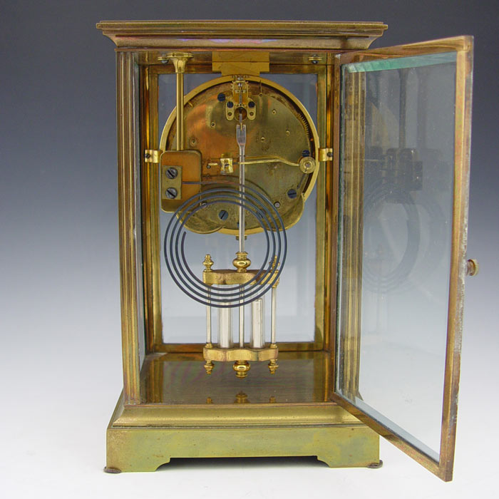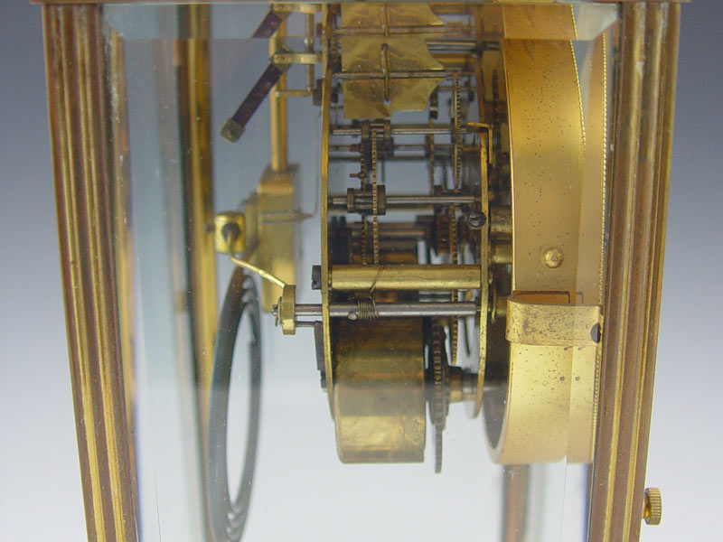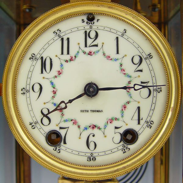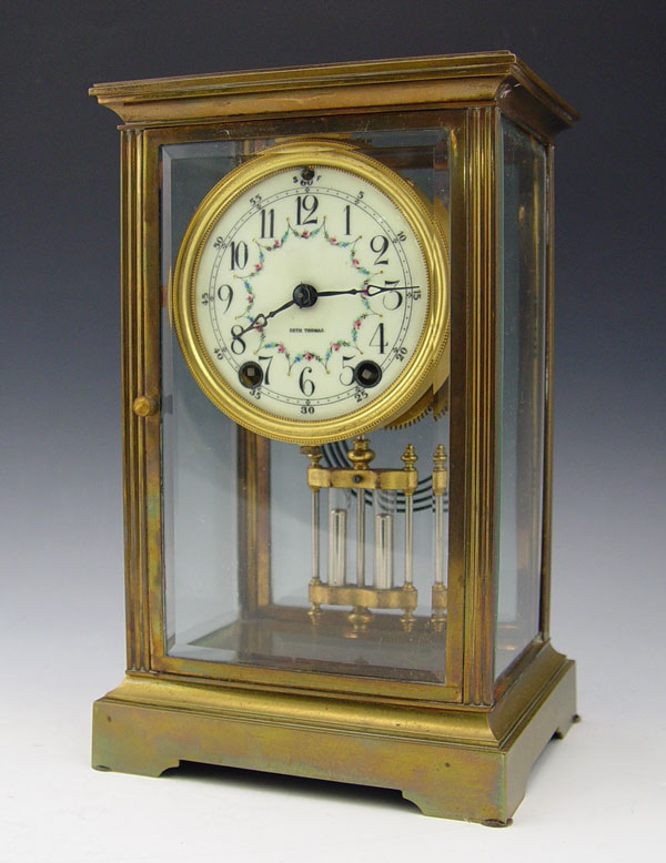 SETH THOMAS CRYSTAL REGULATOR CLOCK: Brass case with beveled glass on all 4 sides. Faux mercury pendulum and key mechanism. 10 7/8'' h x 6 3/4'' x 5 3/8''