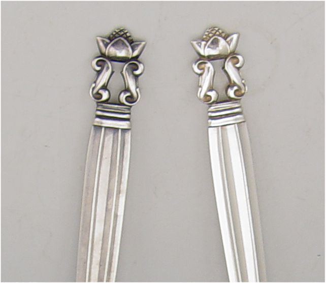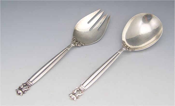 GEORG JENSEN DANISH STERLING ACORN SERVING SET: Serving fork and spoon in the Acorn pattern, marked Georg Jensen. Spoon 9 7/8'', fork 9 1/2''. Approx 7.2 troy oz.