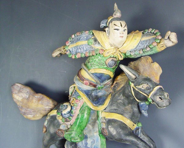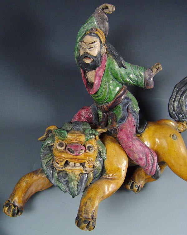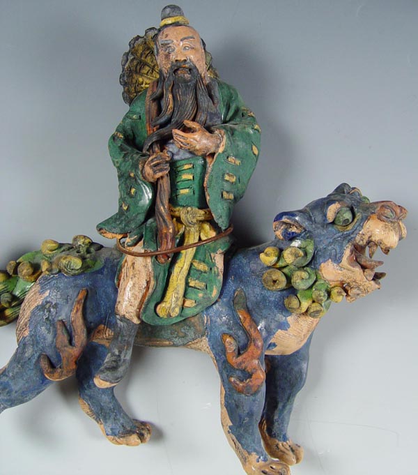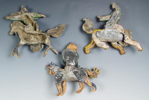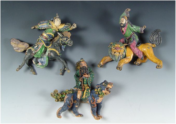 GROUP OF 3 CHINESE FIGURAL ROOF TILES: Early to mid 20th C. reproductions, 3 color glaze. Largest measures 12'' h x 11''.
