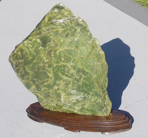 LARGE GREEN SERPENTINE STONE: On wooden display stand. Perfect for Zen garden. Approx 21 1/2'' x 21''.