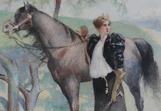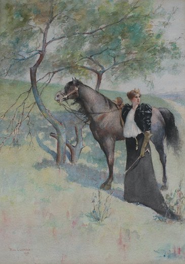 CLAWSON, John Willard, (American, 1858-1936): Equestrian Woman with Horse in a Landscape, Watercolor, sight size 15 1/2'' x 11'', signed and dated 1898, framed, 23 1/2'' x 19''.