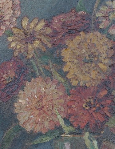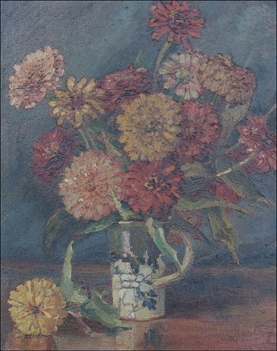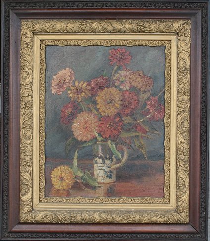 HODGE, Helen, (American, 1870-1958): Dahlias in a Handled Vessel, Oil/Board, 20'' x 16'', signed, painted and carved period frame, 31'' x 27''.