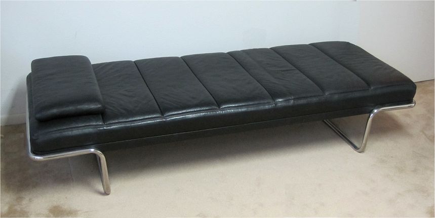 BRAYTON INTERNATIONAL BLACK LEATHER LOUNGER: Chromed tubular metal and leather construction. Measures 15'' h x 76 1/2'' x 30''.