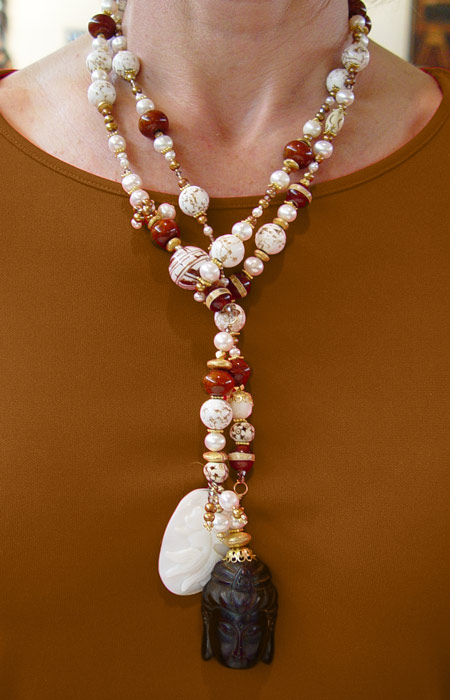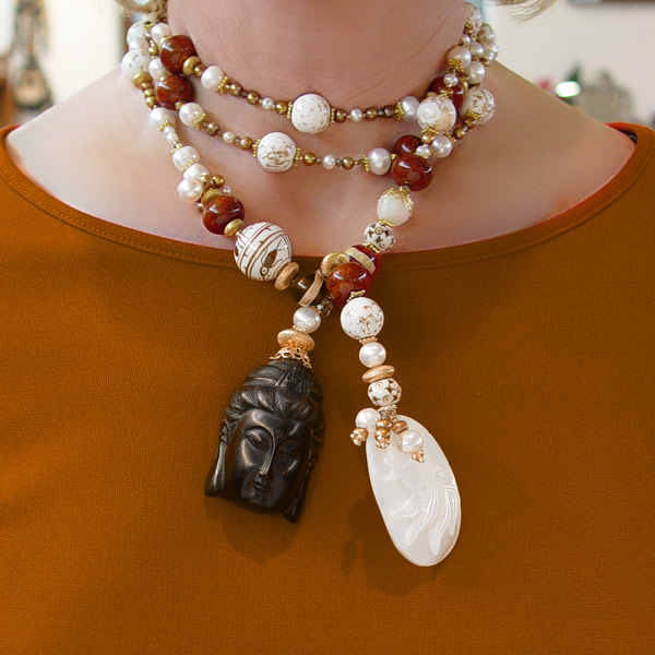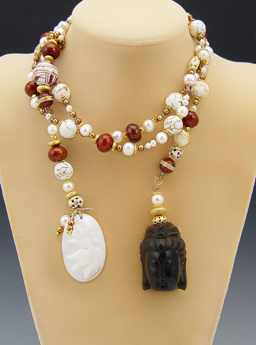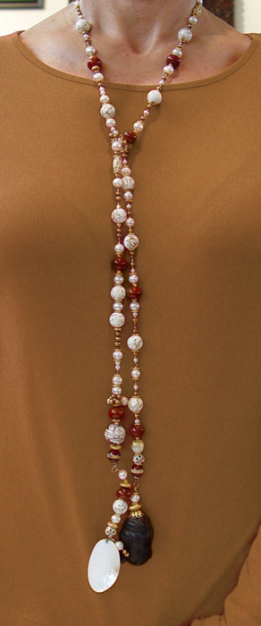 ALICE MENDEZ CAMPOS DESIGNER LARIAT STYLE NECKLACE: Designed and hand crafted by Alice Mendez Campos, New York. 52'' length and styled to be worn in a variety of single, double, triple or side loop. Materials used are white fresh water pearls, Swarovski crystals, mother of pearl, carved Egyptian camel bone, agate, Chinese porcelain, African glass and 14K endings, Strung on 14 strand wire for strength and flexibility.