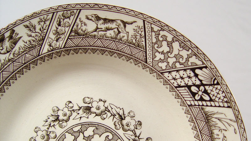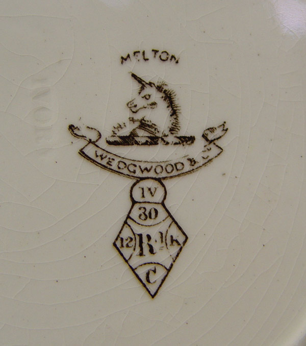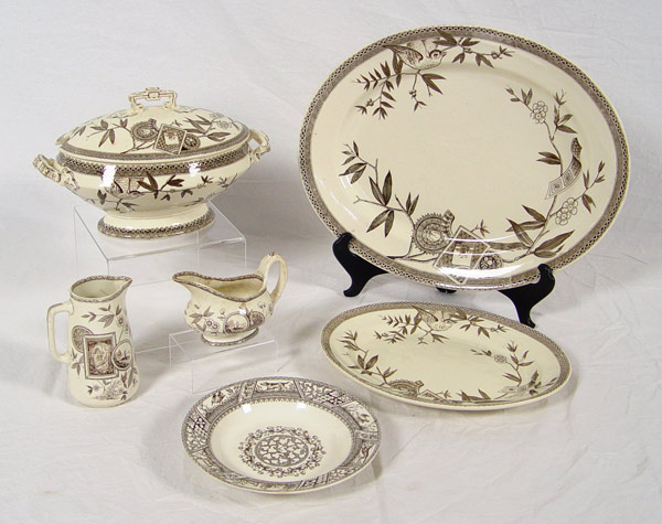 WEDGWOOD ''LOUISE'' BROWN TRANSFERWARE PLUS EXTRAS: Approx. 26 pieces. The Wedgwood includes the 20'' and 14'' platters, oval soup tureen, sugar, and 6 mixed size plates. Sold along with Peraks pattern round covered server, gravy, 2 soup bowls, and a 6 1/4'' pitcher. To add to the assortment are 6 brown transfer square butter pats, and 3 Yosemite soup bowls.