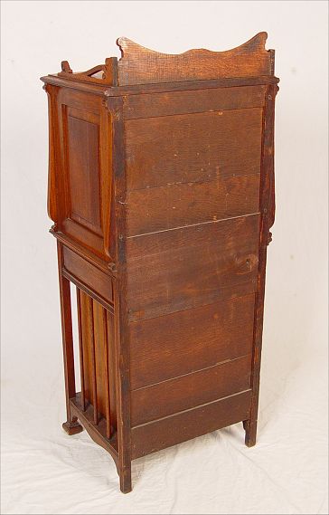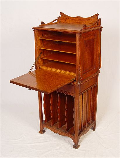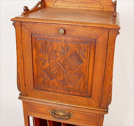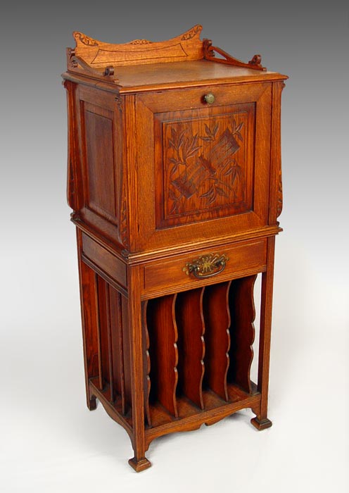 VICTORIAN OAK MUSIC STAND: Carved decoration. Single door over drawer, over 4 slots. Measures 47 1/2'' h. x 20'' x 15 3/4.