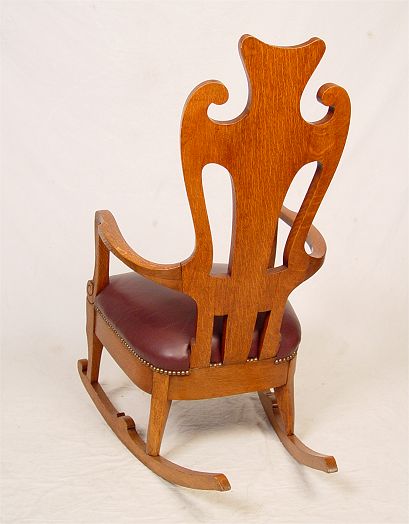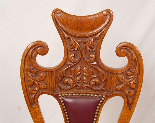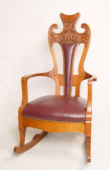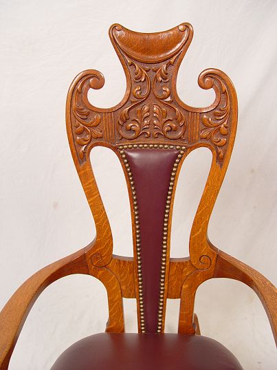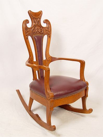 LATE VICTORIAN GOLDEN OAK CARVED ROCKER: Richly carved crest, newer leather upholstery, measures 45'' h. x 24'' x 35 1/2''.