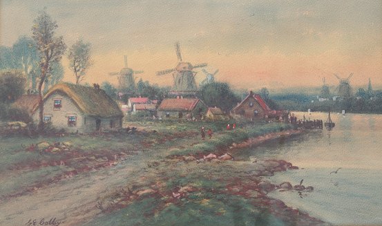 COLBY, George E., (American, 1859-): Dutch Landscape with Windmills, Watercolor, 6 1/2'' x 11'', sight size, signed, framed, 10 1/2'' x 15''.