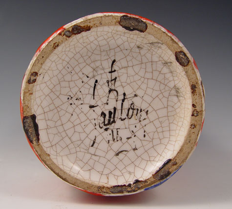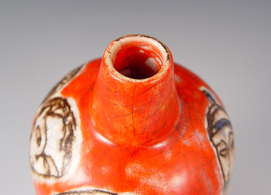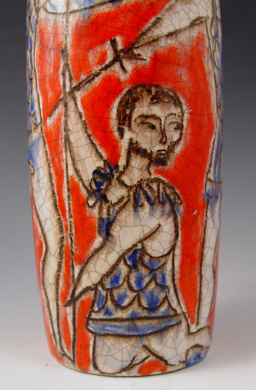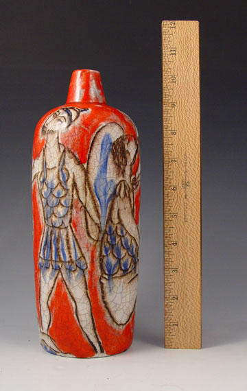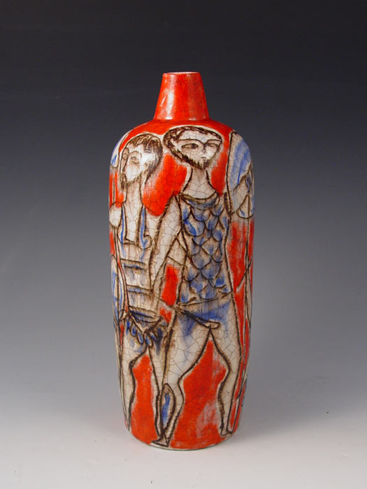 FANTONI ITALIAN CERAMIC VASE: Warrior and angel with trumpet design, overall crazed finish is part of the design. 10'' high. Signed. Est. $300/500**
