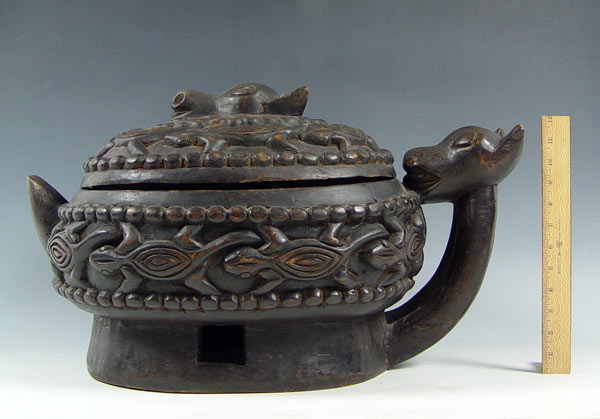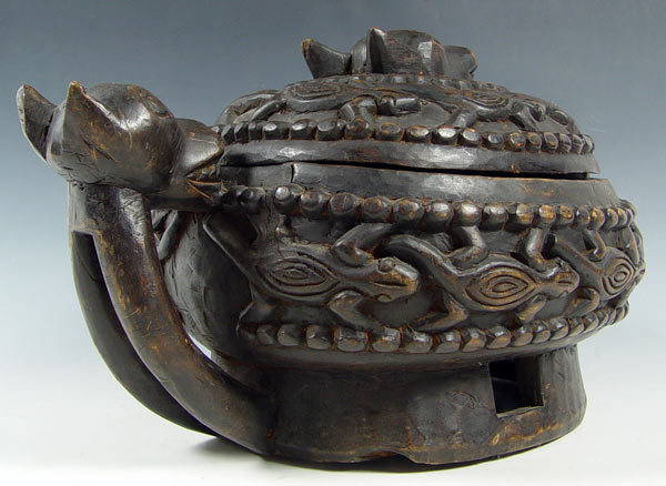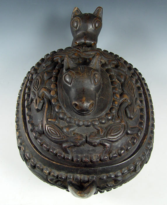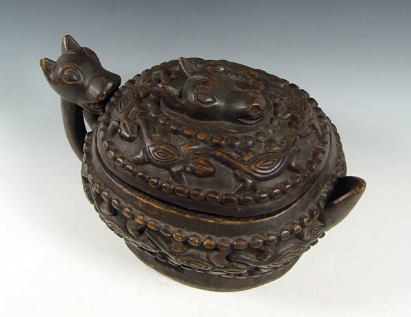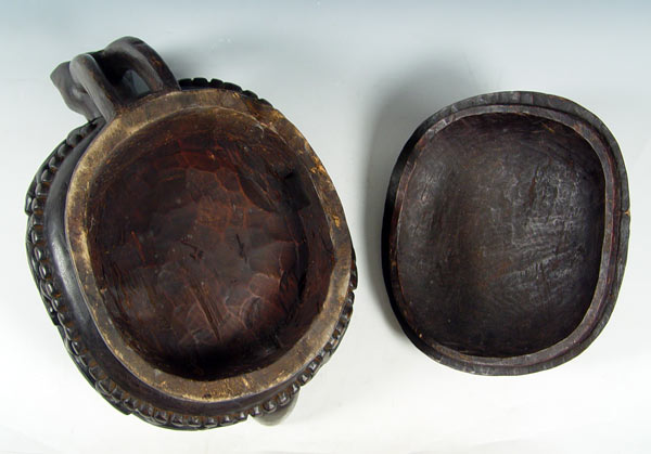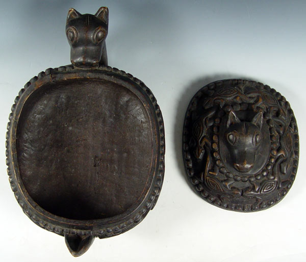 AFRICAN DOG HEAD CARVED WOOD COOKER BOWL: Figural dog base with figural dog carved lid as well. 14 1/2'' x 24'' x 16''.