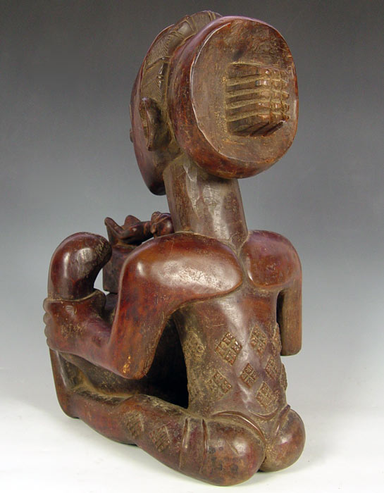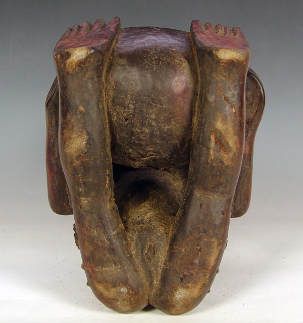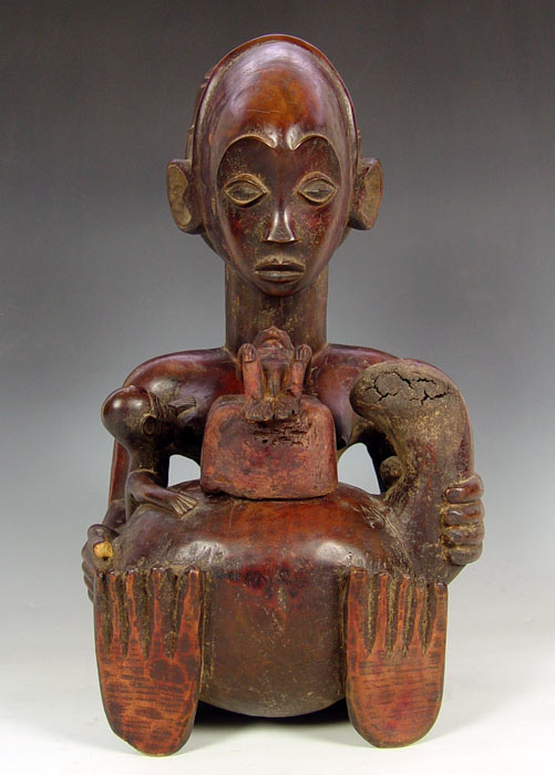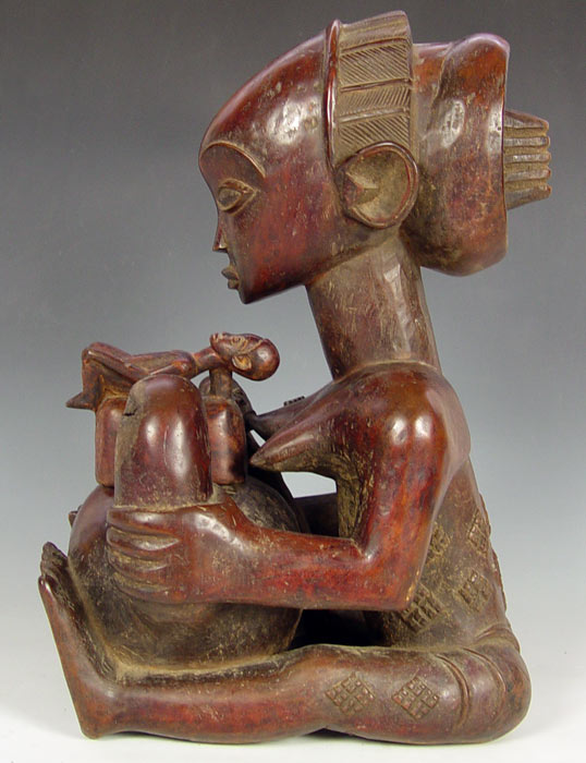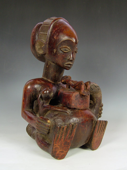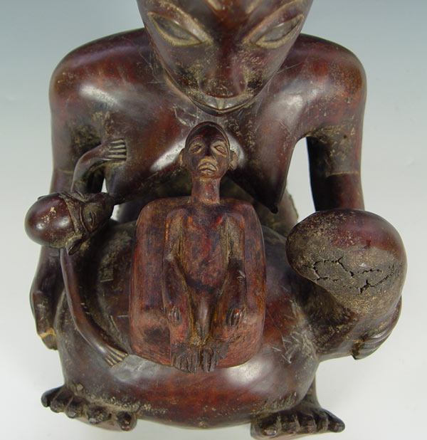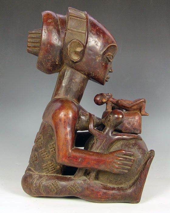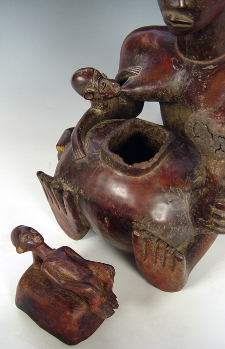 CARVED AFRICAN WOOD VESSEL MOTHER FEEDING: Figural woman feeding one child, cleaning other. 20'' x 11'' x 14''