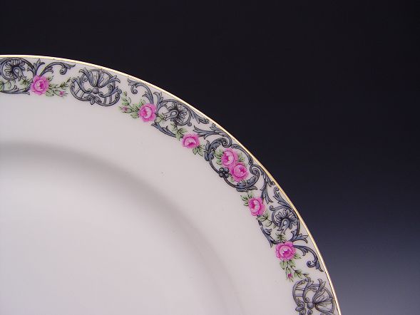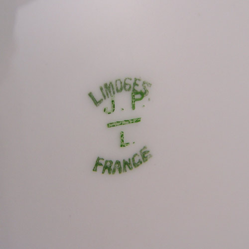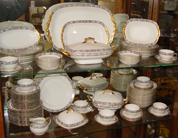 FRENCH LIMOGES FINE CHINA SERVICE: Jean Pouyet, Ca. 1891-1932. 73 pieces to include 2 platters (11.5 and 17''), 2 covered vegetables, open vegetable, relish dish, covered butter or cheese dish 11 dinner plates, 12 salad plates, 12 bread plates, 11 dessert bowls, 8 cups and 12 saucers.