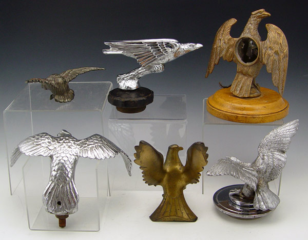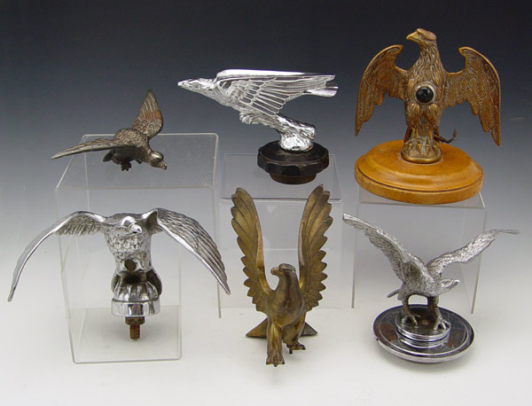 6 PIECE EAGLE CAR MASCOTS: To include 1) Deco eagle on radiator cap. Unmarked 4 3/4'' h x 7''. 2) Eagle with spread wings on chrome radiator cap. Unmarked 5 1/2'' x4 1/2''. 3) Large eagle with spread wings pointing down. Unmarked, 4 1/4'' x 8''. 4) Deco bronzed eagle with spread wings upright marked Frankart. 7'' h. x 4''. 5) Crouching eagle with spread wings. Unmarked. 2 1/4'' x 7''. 6) Electrified bronzed eagle with light interior. Standing spread wings. Mounted to wood base. 6 7/8'' h. x 5 1/2'' base dia.