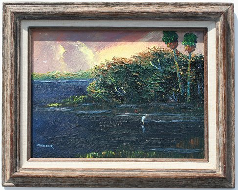 WHEELER, Charles,(American, 20th Century): Florida Highwaymen backwater scene with heron. OIL/Masonite, 9'' x 12'', framed 15 1/2'' x 12 1/2'' Est. $300/500**