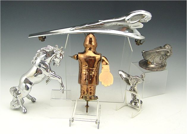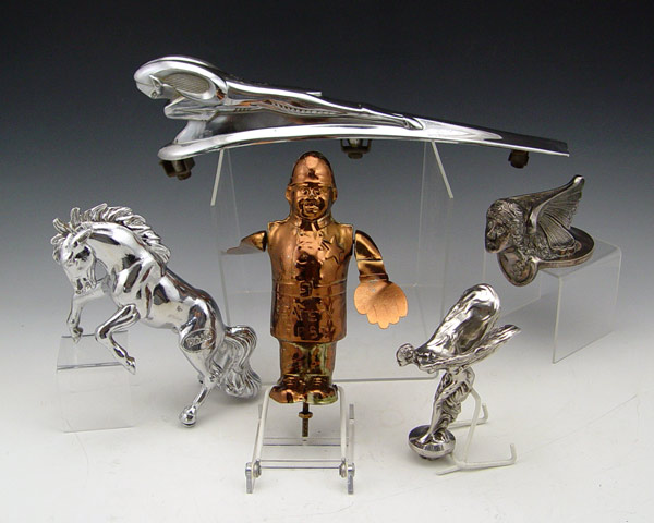 COLLECTION OF 5 FIGURAL CAR MASCOTS: To include 1) Rolls Royce Spirit of Ecstasy style. 4 1/2'' x 2 3/4''. Unmarked. 2) White Truck bucking horse. 8 1/4'' h. x 2 3/4''. 3) Buick Goddess style. 3 1/4'' x 5''. Unmarked. 4) Deco Dodge Ram. 4'' x 13 1/2''. 5) Brass finish Louis Varonson Whirligig ''Safety First'' police officer. 6 1/2'' x 4 3/4''.