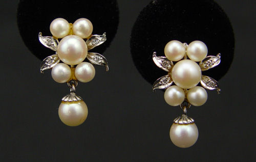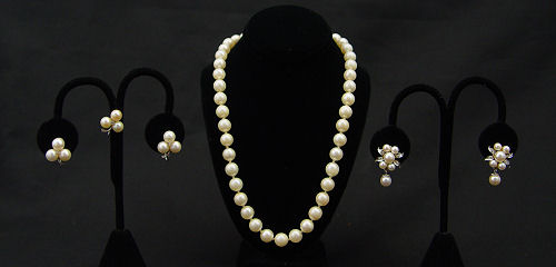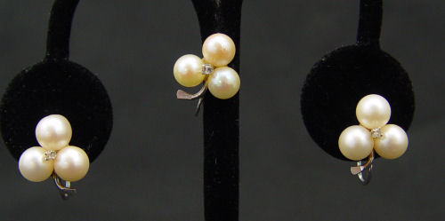 CULTURED PEARL NECKLACE AND PEARL AND DIAMOND EARRINGS: 14'' strand of 7.00 mm cultured pearls with 10K white gold filigree clasp. Sold with two pairs of 14K white gold diamond and cultured pearl earrings plus one extra earring matches one set. The earrings are screw and clip back. Total diamond weight: .15 Ct. Approx. Gold Weight: 6.0 grams Approx.