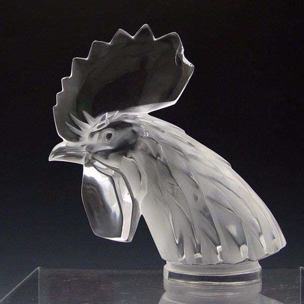 LALIQUE ROOSTER CAR MASCOT: Frosted and clear, signed on base Lalique France. 7 1/4'' h. x 6 1/2'' x 2 3/4''.