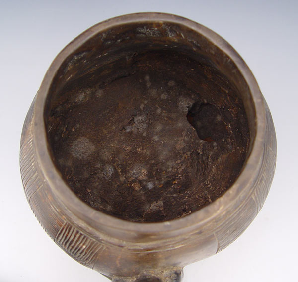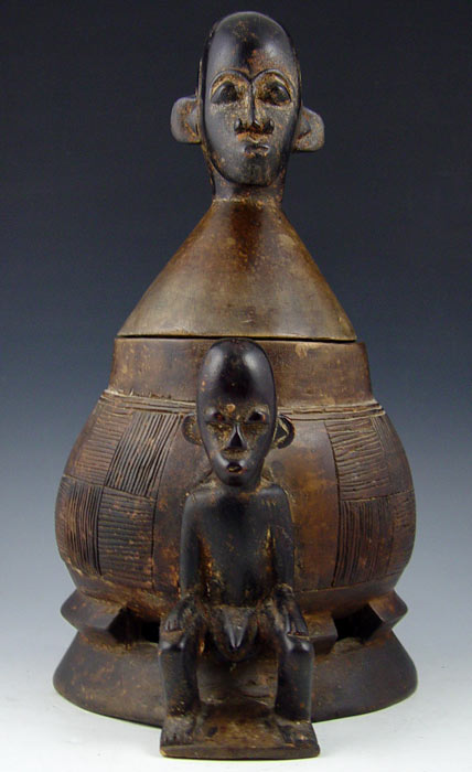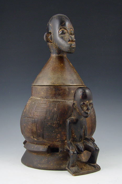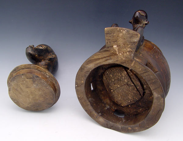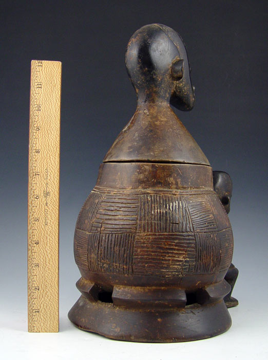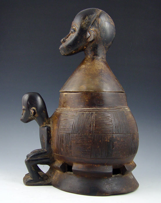 AFRICAN CARVED FIGURAL WOOD POT / COOKER: Figural man lid & seated man front. 14 1/2'' h. x 9 1/2'' dia.