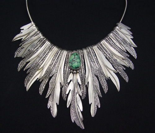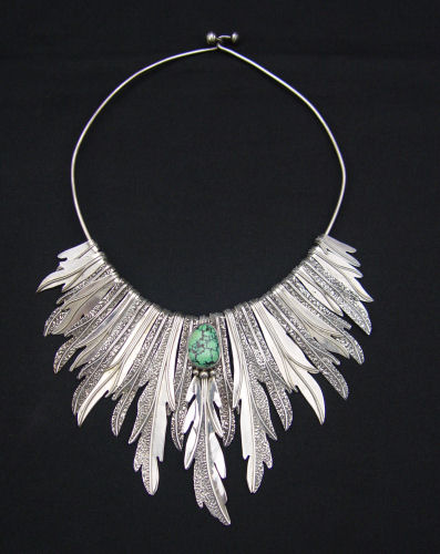 STERLING NATIVE AMERICAN FEATHER & TURQUOISE CHOKER: Signed DR, possibly Dennis Ramone, marked Sterling, longest feather approx. 4'', opening of collar approx. 5'' x 5 1/2'', 3.3 troy oz.